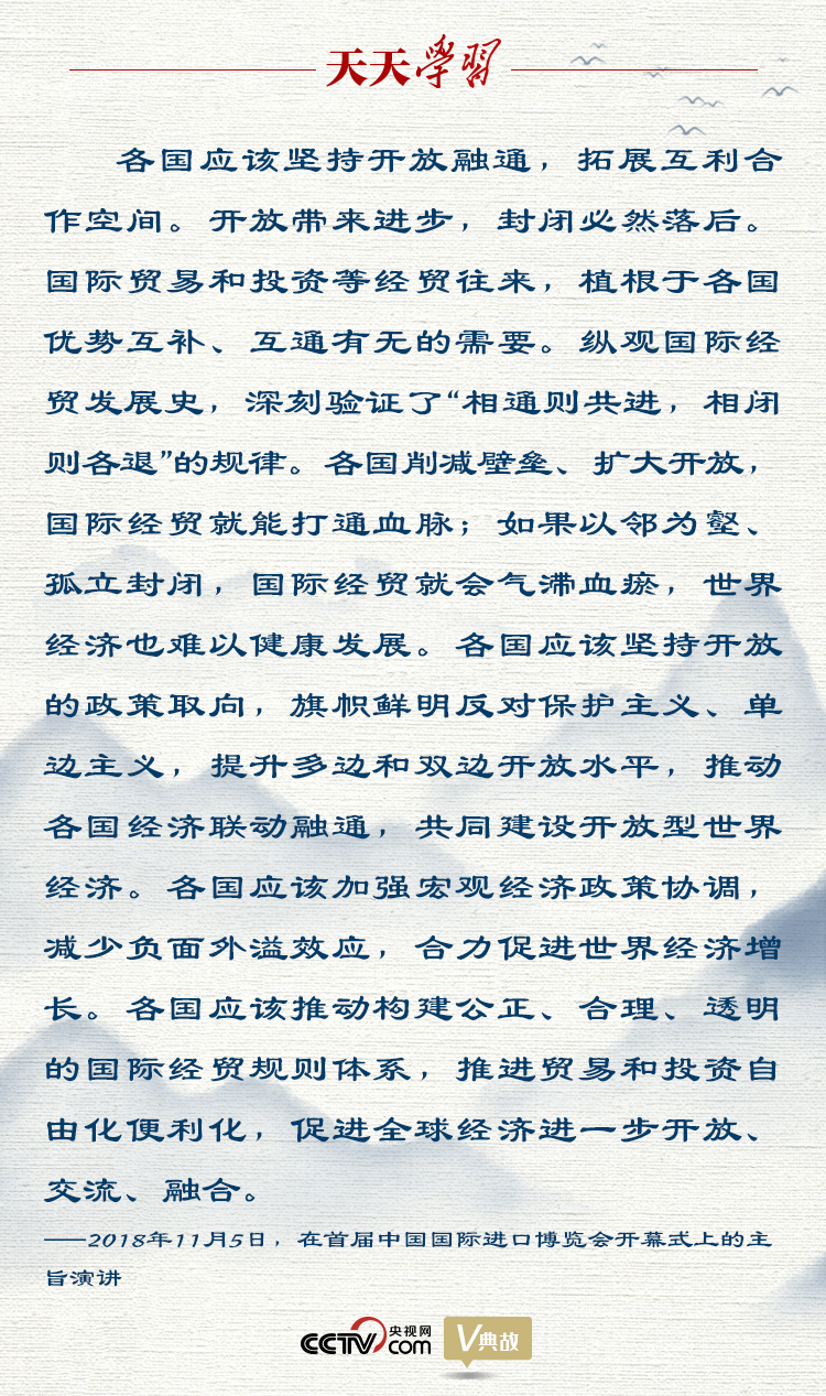 “相通则共进,相闭则各退”,习近平主席改字以立新意,赋予原典以新的时代内涵,指出国家与国家之间相互沟通交流就能共同进步,相互封闭隔绝就会各自退步。他还借中医“通闭解结”理论进一步加以阐述:各国削减壁垒、扩大开放,国际经贸就能打通血脉;如果以邻为壑、孤立封闭,国际经贸就会气滞血瘀,世界经济也难以健康发展。