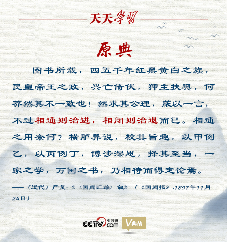 “相通则共进,相闭则各退”,是对严复《〈国闻汇编〉叙》中“相通则治进,相闭则治退”的化用。