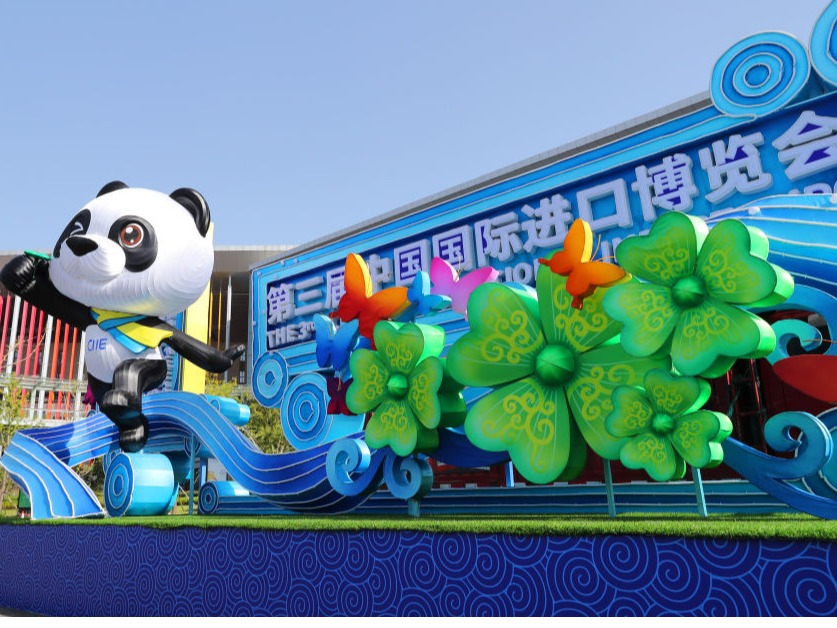 这是国家会展中心(上海)西入口处摆放的熊猫“进宝”主题进博会装饰(10月23日摄)。新华社记者 方喆 摄