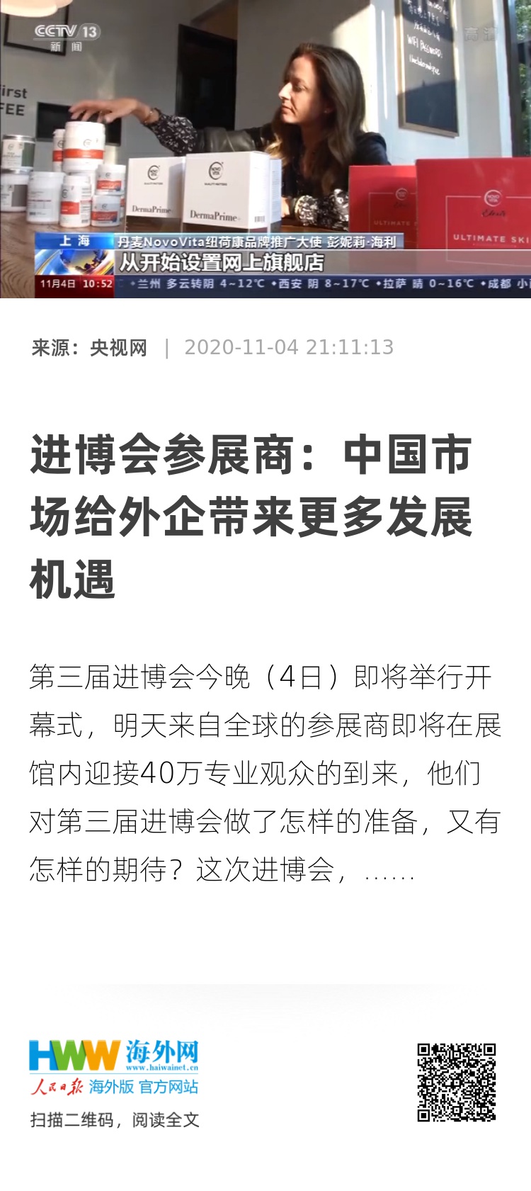 这次进博会,来自丹麦的诺和维他除了将展示明星款的保健品外,还带来了多款儿童新品。得益于外商投资法、跨境电商等新业态扶持的一系列政策的实施,一年来,公司产品网上销售额迅速提升。