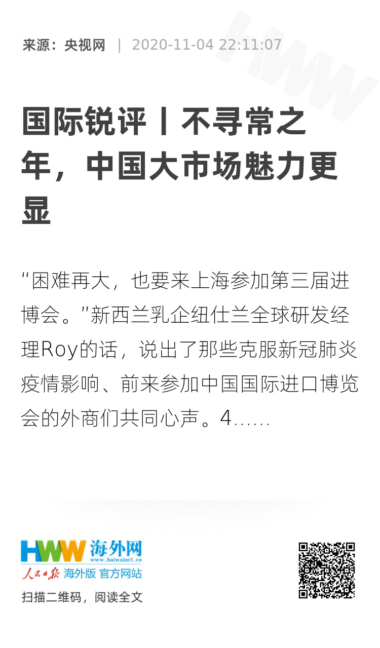 在这背后,是中国持续扩大开放的努力。今年以来,中国两次出台稳外资新政策,发布新版全国和自贸试验区负面清单,设立海南自由贸易港,增设3个自贸试验区,营商环境持续优化……如今,这个拥有14亿人口并且消费不断升级的市场,正通过进博会这个平台发出“迎五洲客,计天下利”的最强音。而这恰恰是当前正经历灰暗时刻的世界经济难以听到、却亟需听到的声音。