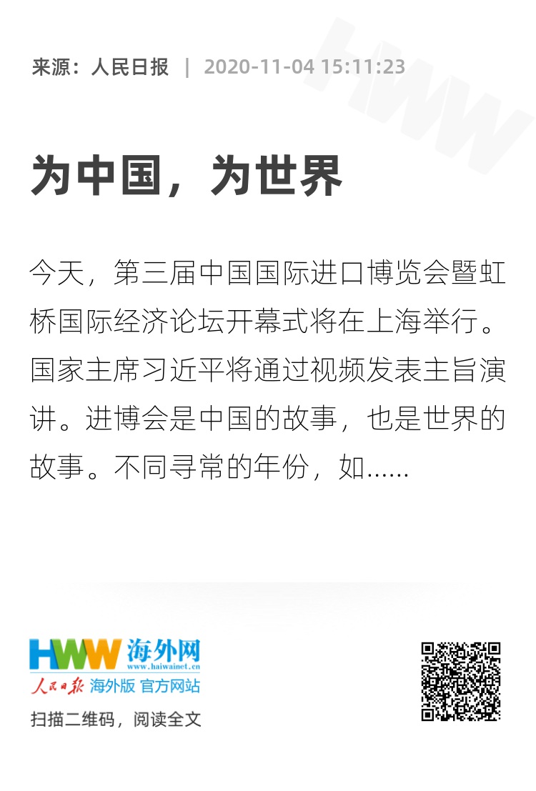 进博会是中国的故事,也是世界的故事。不同寻常的年份,如期举办的盛会,传递着中国坚定不移全面扩大开放的决心,同时为处于动荡变革期的世界增加了更多确定性。