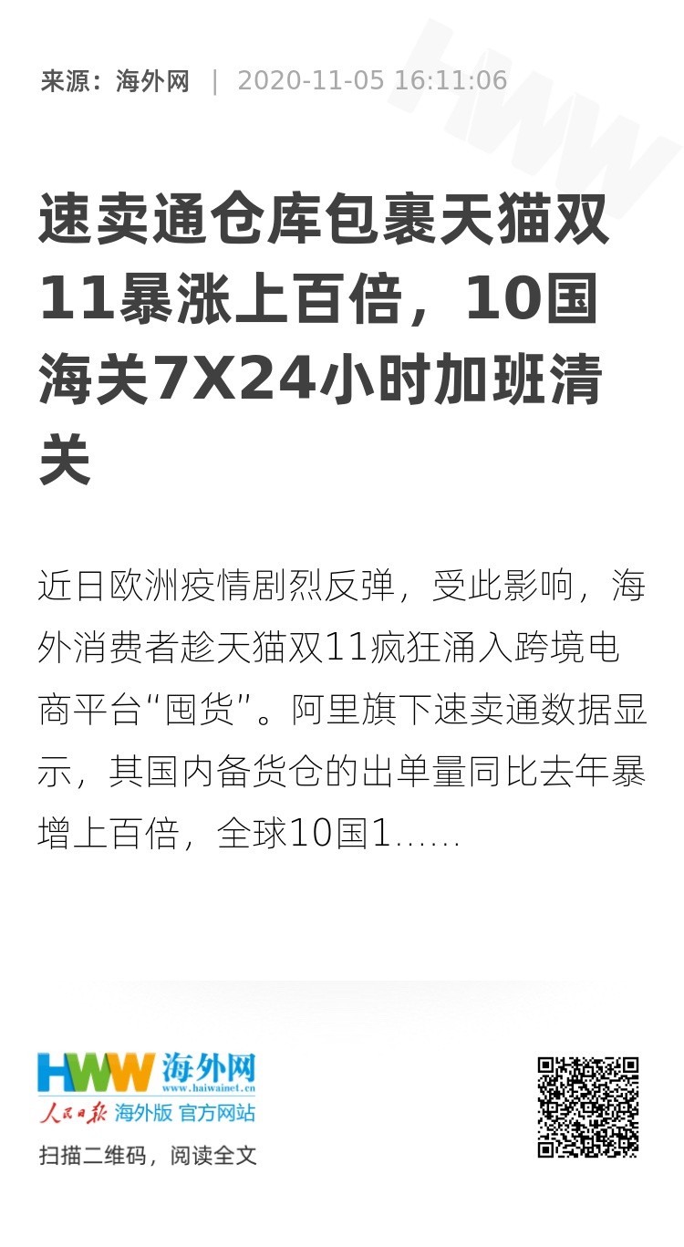 近日欧洲疫情剧烈反弹,受此影响,海外消费者趁天猫双11疯狂涌入跨境电商平台“囤货”。阿里旗下速卖通数据显示,其国内备货仓的出单量同比去年暴增上百倍,全球10国12个口岸紧急开启周末无休24小时加班清关模式。