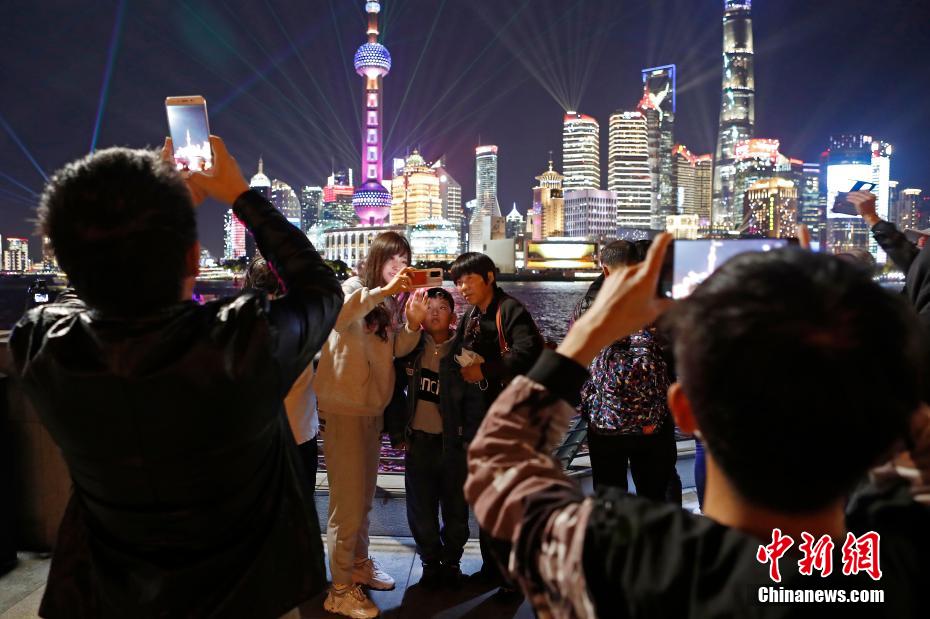 11月4日晚,新版进博会主题光影秀在上海黄浦江两岸上演,上海用五彩斑斓的灯光和悠扬炫动的音乐迎接第三届中国国际进口博览会如期举办。图为上海浦江两岸上演进博会光影秀。 殷立勤 摄