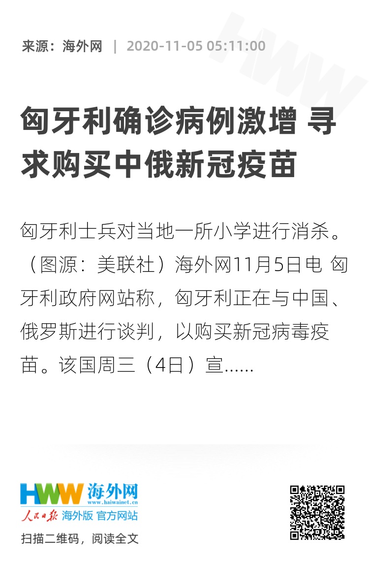海外网11月5日电 匈牙利政府网站称,匈牙利正在与中国、俄罗斯进行谈判,以购买新冠病毒疫苗。该国周三(4日)宣布加强对新冠病毒的限制。