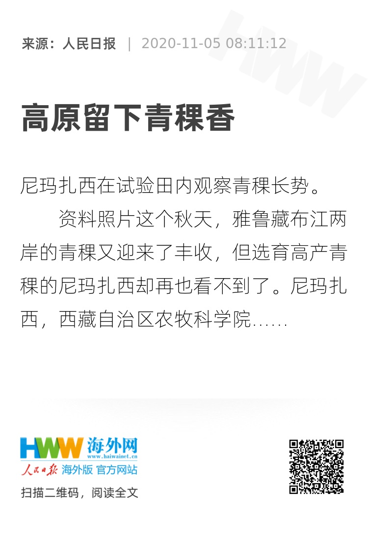 斯人已去,留下麦香绵绵,尼玛扎西毕生坚守的科技报国精神,连同他培育的无数青稞种子,已撒遍雪域高原的山山水水。(人民日报记者 申琳 袁泉 鲜敢)