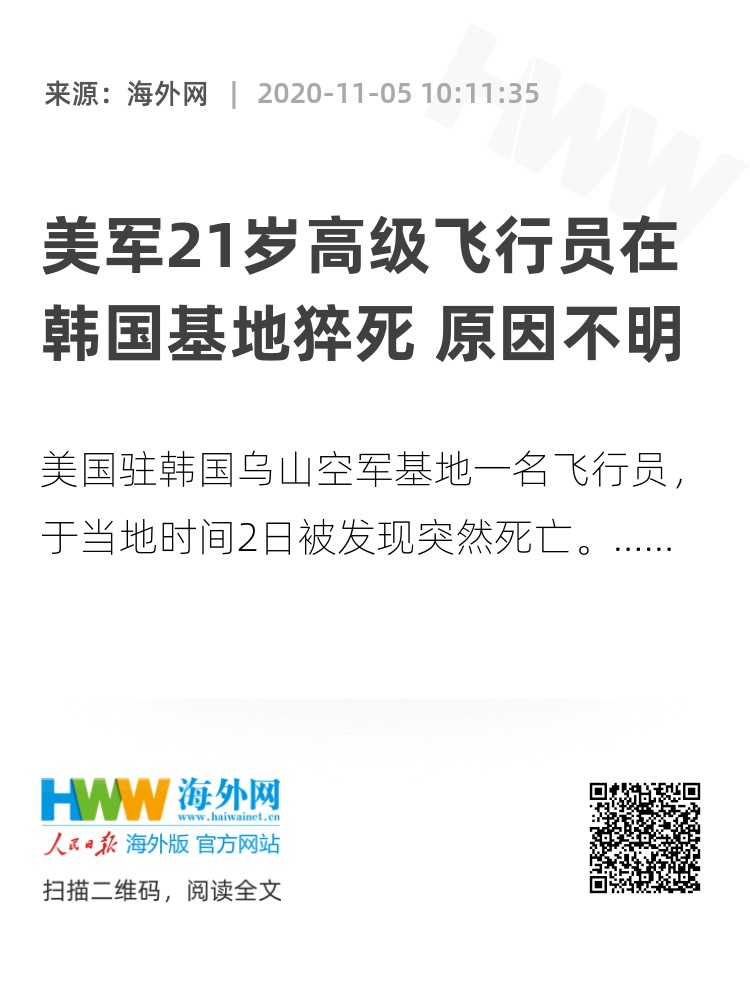 海外网11月5日电 美国驻韩国乌山空军基地一名飞行员,于当地时间2日被发现突然死亡,死亡原因仍在调查中。