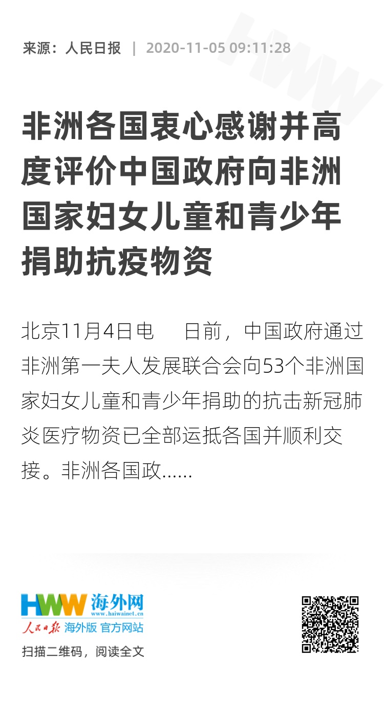 非洲各国政府和社会各界人士纷纷表示,非洲抗疫物资匮乏,中方克服国际运输困难,将物资及时运抵非洲53个国家,对当地妇女儿童和青少年渡过疫情难关如同雪中送炭,体现了中国人民对非洲人民的真情谊、真帮助,是非中携手抗疫、共克时艰的生动写照,非洲人民将铭记于心。疫情不分国界,各国守望相助、团结合作才能战而胜之。中方积极开展国际抗疫合作,向包括非洲国家在内的世界各国提供援助,彰显了高尚的人道主义情怀和建设性合作精神。习近平主席在今年6月中非团结抗疫特别峰会上提出的重要倡议令非洲各国深受鼓舞。非方愿同中方加强合作,携手战胜疫情。相信非中传统友谊将在团结抗疫中进一步升华。