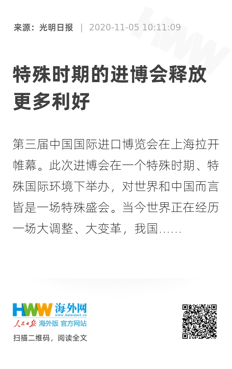 第三届中国国际进口博览会在上海拉开帷幕。此次进博会在一个特殊时期、特殊国际环境下举办,对世界和中国而言皆是一场特殊盛会。