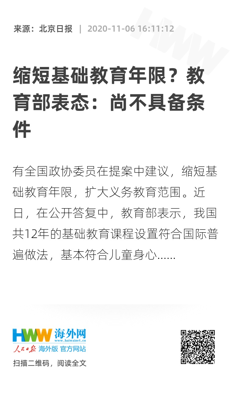 有全国政协委员在提案中建议,缩短基础教育年限,扩大义务教育范围。近日,在公开答复中,教育部表示,我国共12年的基础教育课程设置符合国际普遍做法,基本符合儿童身心发展规律和认知规律,目前还不具备缩短学制和将普通高中纳入义务教育的条件。