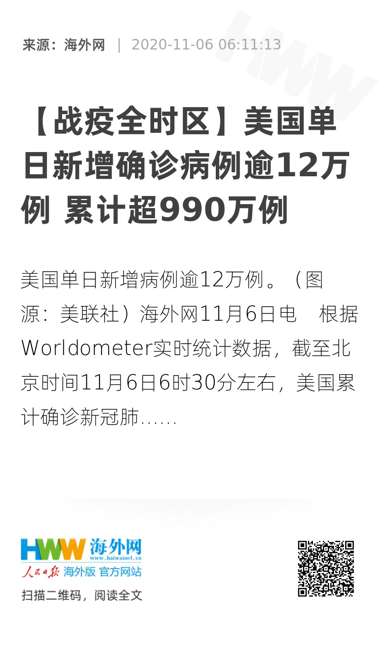 海外网11月6日电 根据Worldometer实时统计数据,截至北京时间11月6日6时30分左右,美国累计确诊新冠肺炎病例9901453例,累计死亡240815例。与前一日6时30分数据相比,美国新增确诊病例121163例,新增死亡病例1193例。