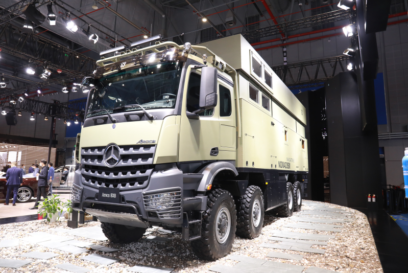 图为奔驰带来的一款Arocs重型卡车底盘,可以适应复杂路况,搭载大型房车。(王俊岭/摄)