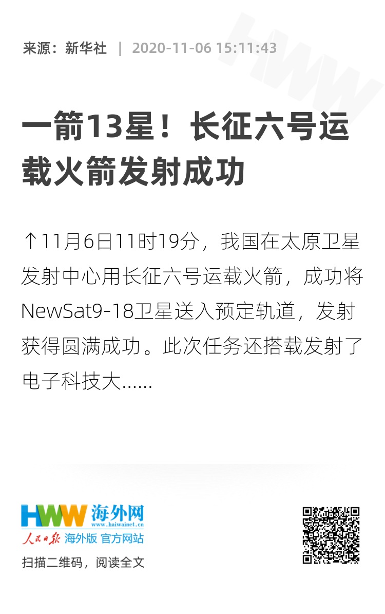 新华社太原11月6日电(李国利、朱霄雄)一箭13星!6日11时19分,我国在太原卫星发射中心用长征六号运载火箭,成功将NewSat9-18卫星送入预定轨道,发射获得圆满成功。此次任务还搭载发射了电子科技大学号卫星、北航空事卫星一号和八一03星。