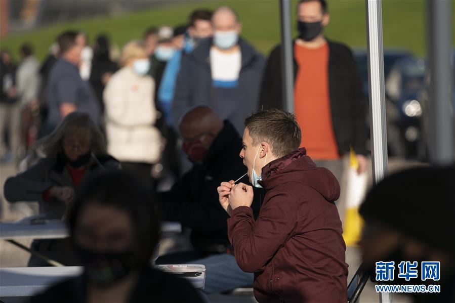 11月6日,一名男子在英国利物浦的一处新冠病毒检测点采样。 当日,利物浦开展全城范围新冠病毒检测,当地或在那里工作的人无论是否出现症状,都可以接受检测。这是英国首次在城市开展全城范围的大规模新冠检测。 新华社发(乔恩·休珀摄)