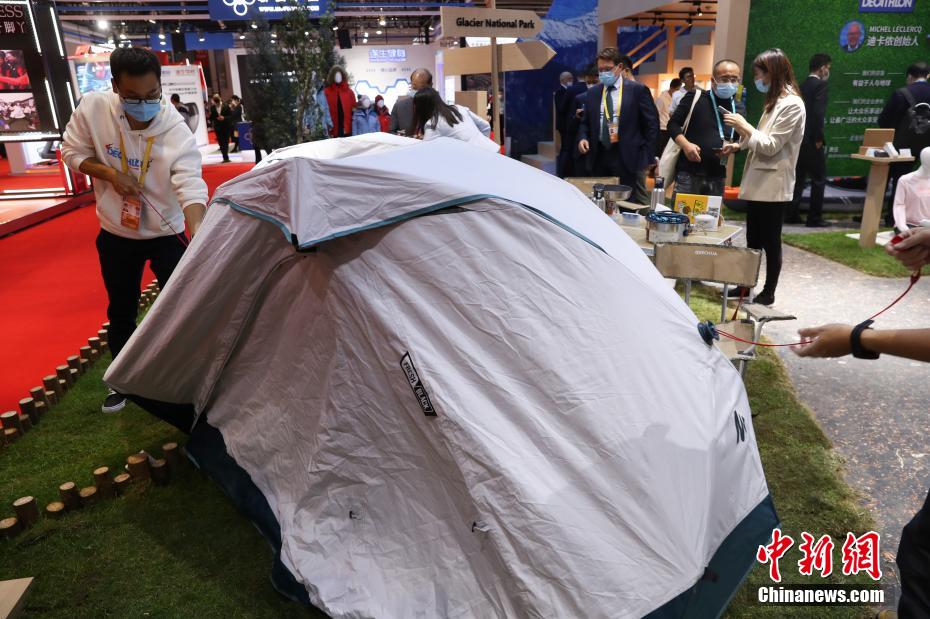 迪卡侬带来的快速折叠帐篷展开只需3秒。 中新社记者 张亨伟 摄