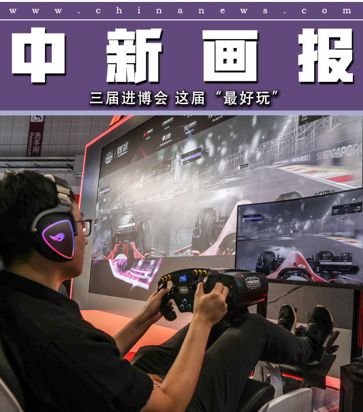第三届中国国际进口博览会正在火热举行。本届进博会首次设置了体育用品赛事专区,成为最吸引观众互动体验的展区之一。7300平米的展区内,观众们打篮球、划赛艇、玩游戏、比赛车、搭帐篷,一项项好玩、新奇、有趣的互动项目让本届进博会被誉为“最好玩”的一届展会。图为明星级选手展开F1电竞比赛。 中新社记者 张亨伟 摄
