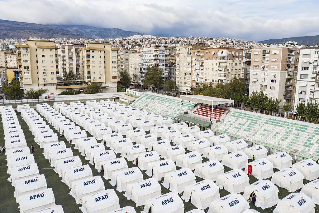 当地时间2020年11月6日,土耳其伊兹密尔,土耳其灾害和应急管理部门(AFAD)在博尔诺瓦体育场里搭建帐篷,建成了一座临时“城市”,用于安置灾民以满足对住所的需要。此前,爱琴海沿岸发生6.6级地震,土耳其伊兹密尔灾情严重。土耳其灾害和应急管理部门4日说,该部门已经结束震后搜救工作,死亡人数至此上升至116人,其中114人在土第三大城市伊兹密尔遇难。图片来源:人民视觉/视觉中国