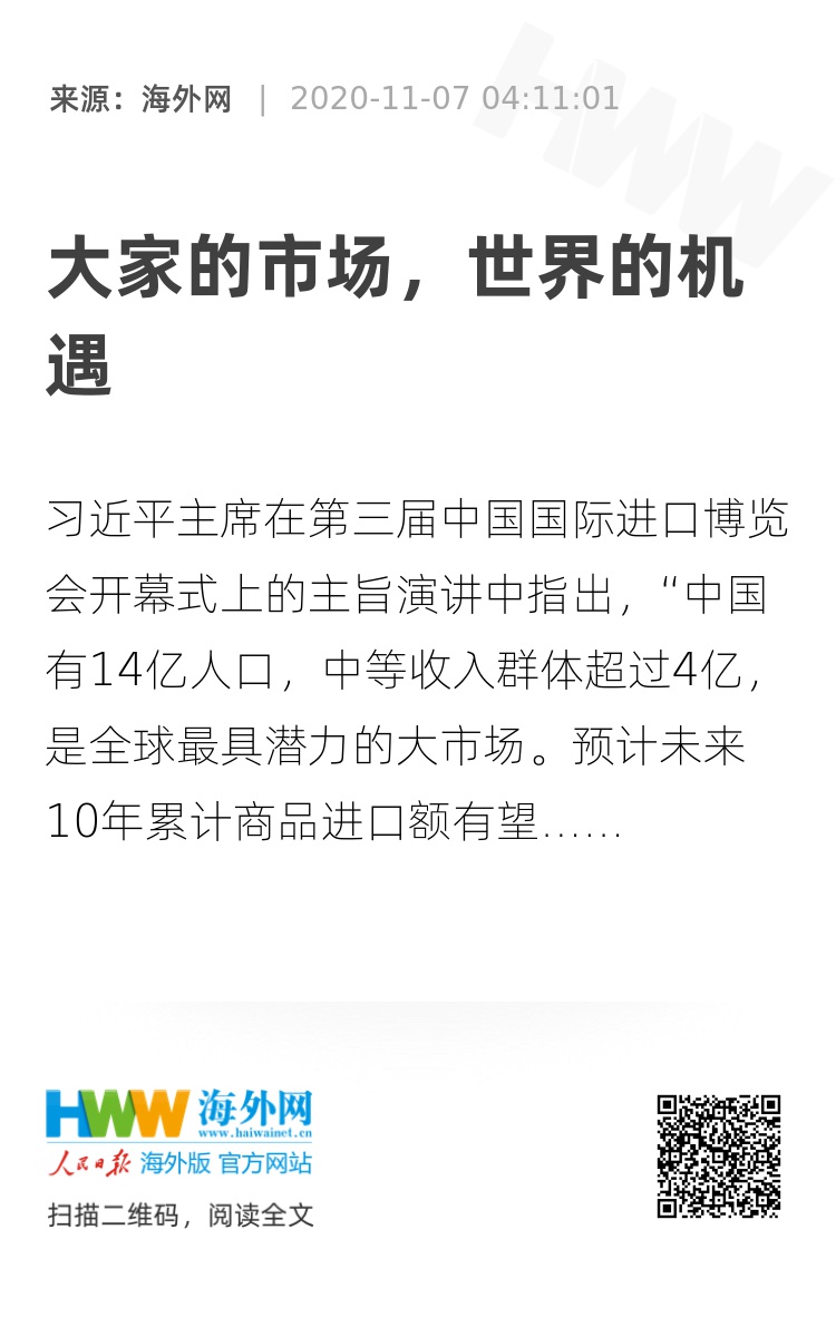 习近平主席在第三届中国国际进口博览会开幕式上的主旨演讲中指出,“中国有14亿人口,中等收入群体超过4亿,是全球最具潜力的大市场。预计未来10年累计商品进口额有望超过22万亿美元。”数字背后,正是如大海一般的中国市场。