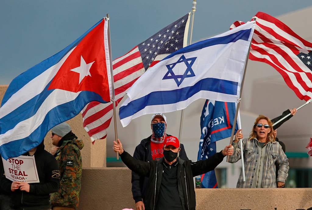 当地时间2020年11月7日,美媒测算拜登率先获得270张选举人票,特朗普的支持者开始在美国多个州的首府举行抗议示威。他们号召在美国50个州的首府和主要城市举行所谓“和平抗议”。有执法人员表示,一些参加抗议示威的特朗普支持者携带枪支。消息来源:央视新闻。图片作者:人民视觉