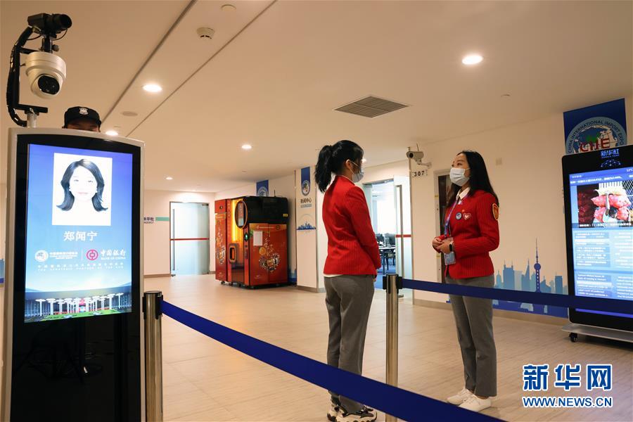 11月4日,志愿者郑闻宁(右)与同事交接工作。 第三届中国国际进口博览会正在上海举行。展会工作人员和保障人员在举办地国家会展中心(上海)坚守岗位,确保各项环节顺利进行。多才多艺的进博会志愿者“小叶子”、手艺精湛的食堂大厨、细心周到的穿梭巴士司机……身居幕后、无私奉献的保障团队,组成了进博会一条靓丽的风景线。 新华社记者 卢烨 摄