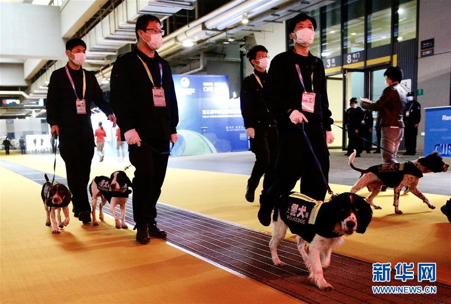11月4日,工作人员带领警犬在第三届进博会场馆内巡逻。 第三届中国国际进口博览会正在上海举行。展会工作人员和保障人员在举办地国家会展中心(上海)坚守岗位,确保各项环节顺利进行。多才多艺的进博会志愿者“小叶子”、手艺精湛的食堂大厨、细心周到的穿梭巴士司机……身居幕后、无私奉献的保障团队,组成了进博会一条靓丽的风景线。 新华社记者 张玉薇 摄