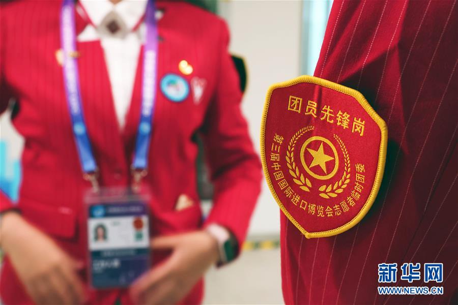 11月4日在第三届进博会新闻中心拍摄的志愿者臂章。 第三届中国国际进口博览会正在上海举行。展会工作人员和保障人员在举办地国家会展中心(上海)坚守岗位,确保各项环节顺利进行。多才多艺的进博会志愿者“小叶子”、手艺精湛的食堂大厨、细心周到的穿梭巴士司机……身居幕后、无私奉献的保障团队,组成了进博会一道靓丽的风景线。 新华社记者 卢烨 摄