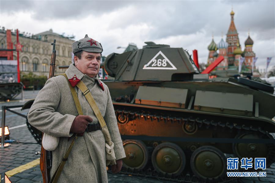 11月7日,在俄罗斯首都莫斯科,一名身着二战时期军装的志愿者在露天展览上工作。 当日,俄罗斯在红场举行露天展览,纪念1941年苏联红场阅兵式。 新华社发(叶甫盖尼·西尼岑摄)