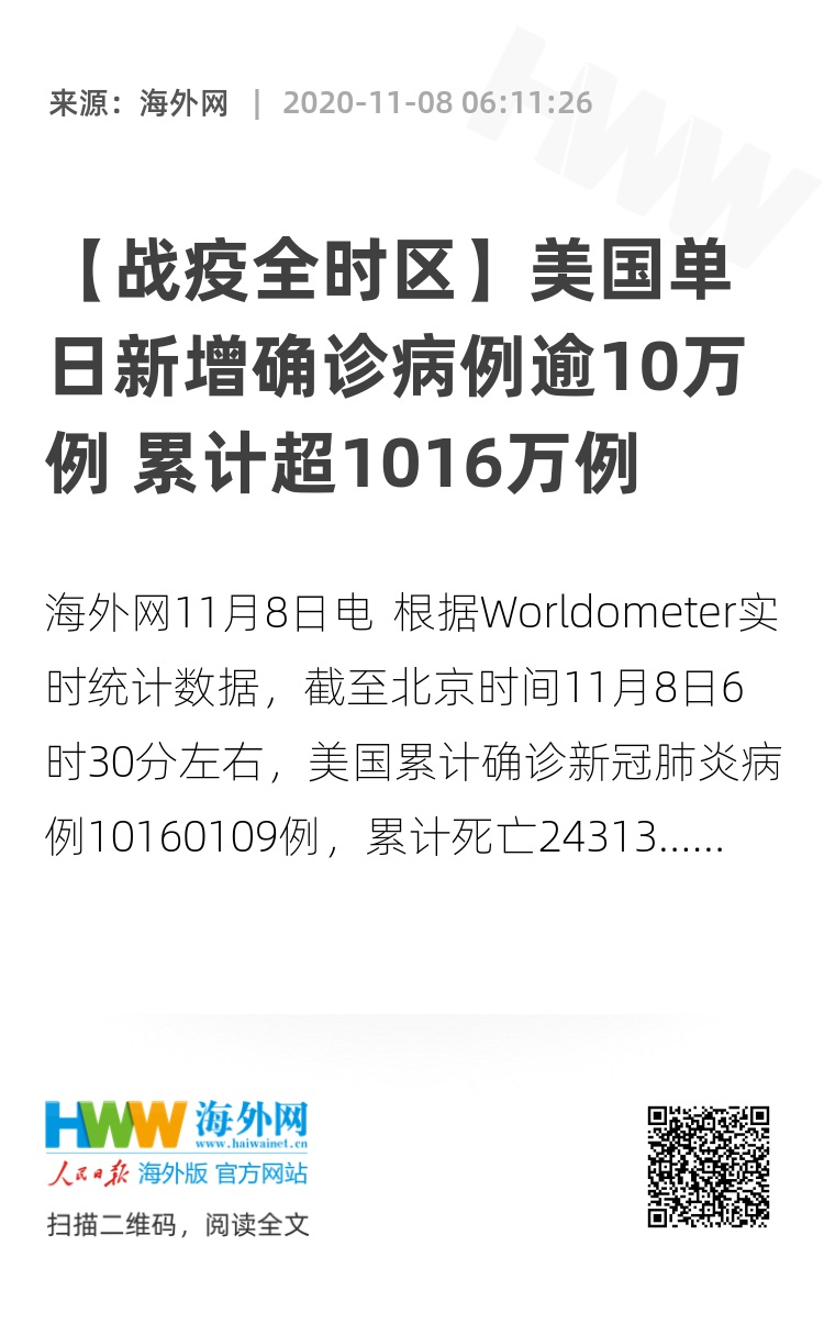 海外网11月8日电 根据Worldometer实时统计数据,截至北京时间11月8日6时30分左右,美国累计确诊新冠肺炎病例10160109例,累计死亡243139例。与前一日6时30分数据相比,美国新增确诊病例101523例,新增死亡病例910例。