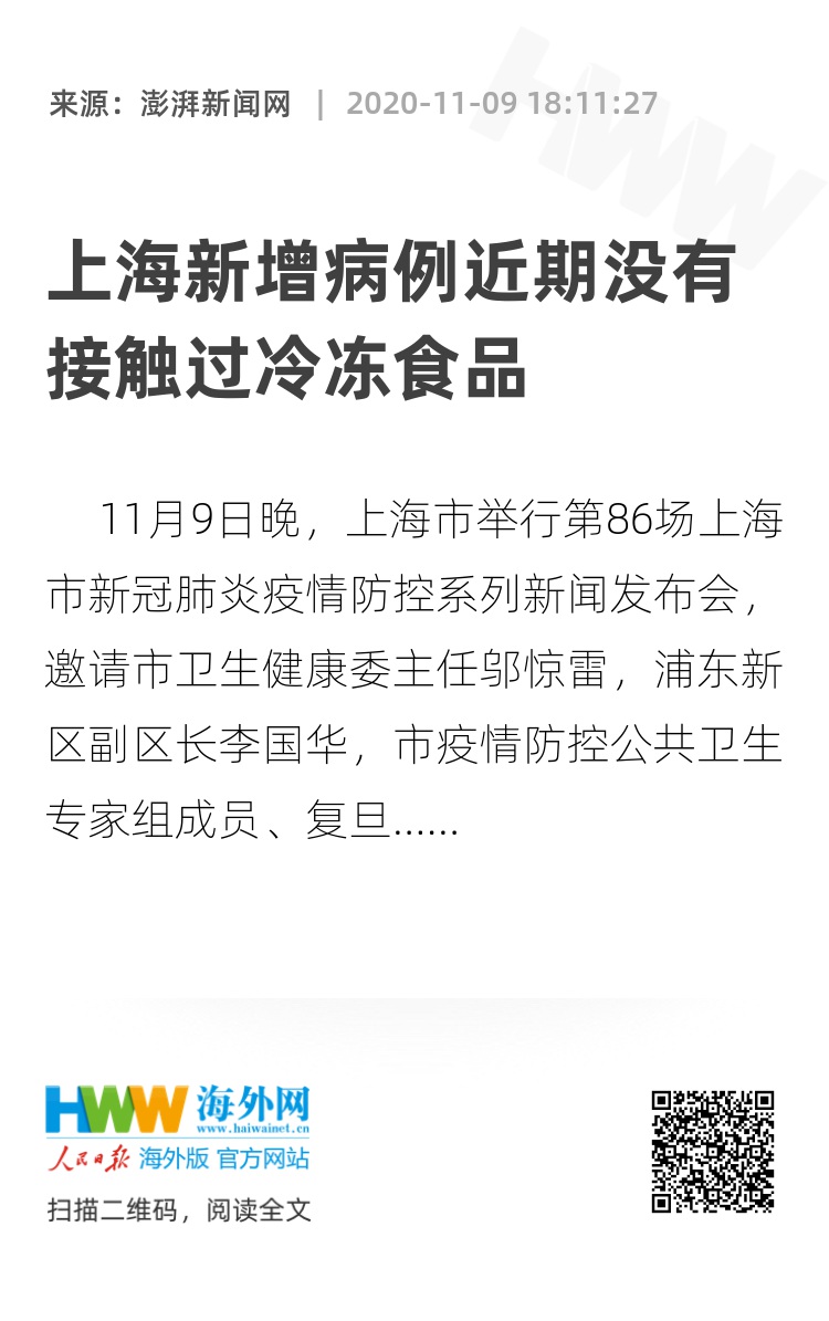 根据目前的调查情况,患者本人近期没有接触过冷冻食品,其从事的工作与确诊前的行动轨迹均与第三届进博会没有关联。