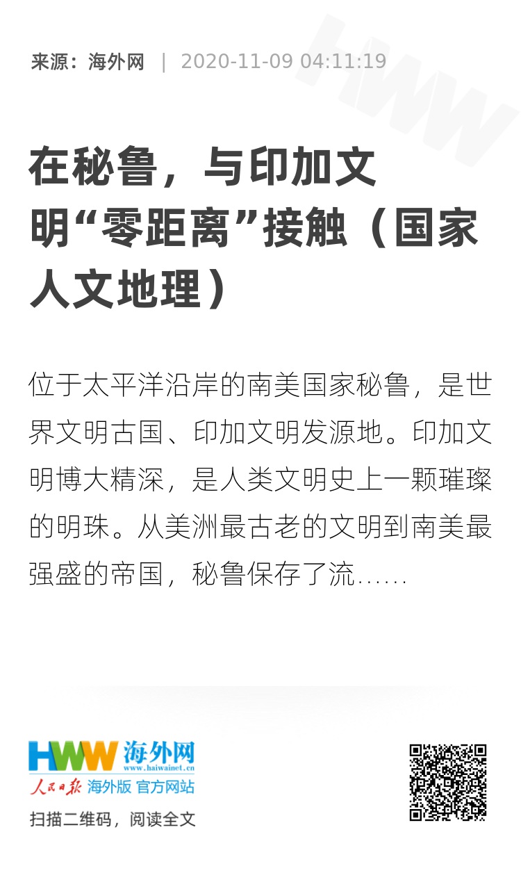 位于太平洋沿岸的南美国家秘鲁,是世界文明古国、印加文明发源地。印加文明博大精深,是人类文明史上一颗璀璨的明珠。