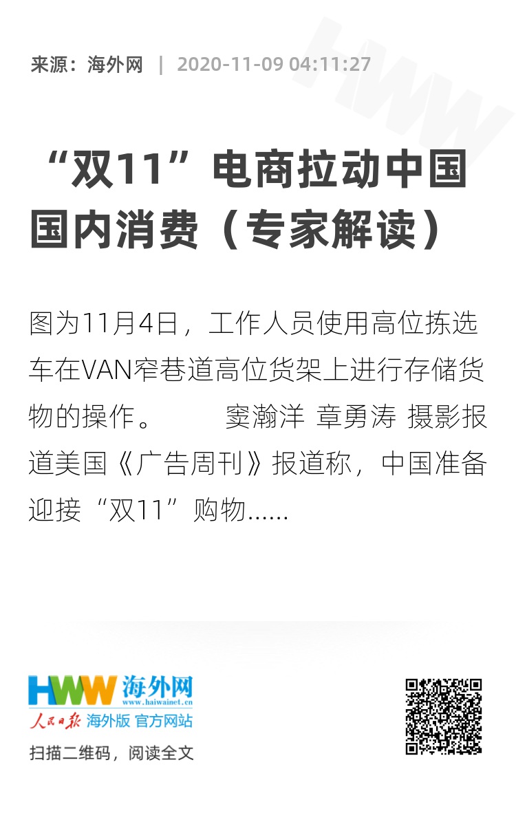 印度《印度教徒报》刊文称,今年“双11”对于消费者乃至整个中国经济都具有特殊意义。网购,尤其是今年在直播的推动下,已经成为国内消费的驱动器。事实上,这种网购繁荣景象在许多方面都是中国努力把国内消费提升为经济增长驱动器的关键。在新冠肺炎疫情发生后,这一雄心显得比以往更加急迫。第三季度,中国经济较上年同期增长4.9%,在全球主要经济体中风景独好。消费开支的持续复苏将是中国经济回升向好的关键。