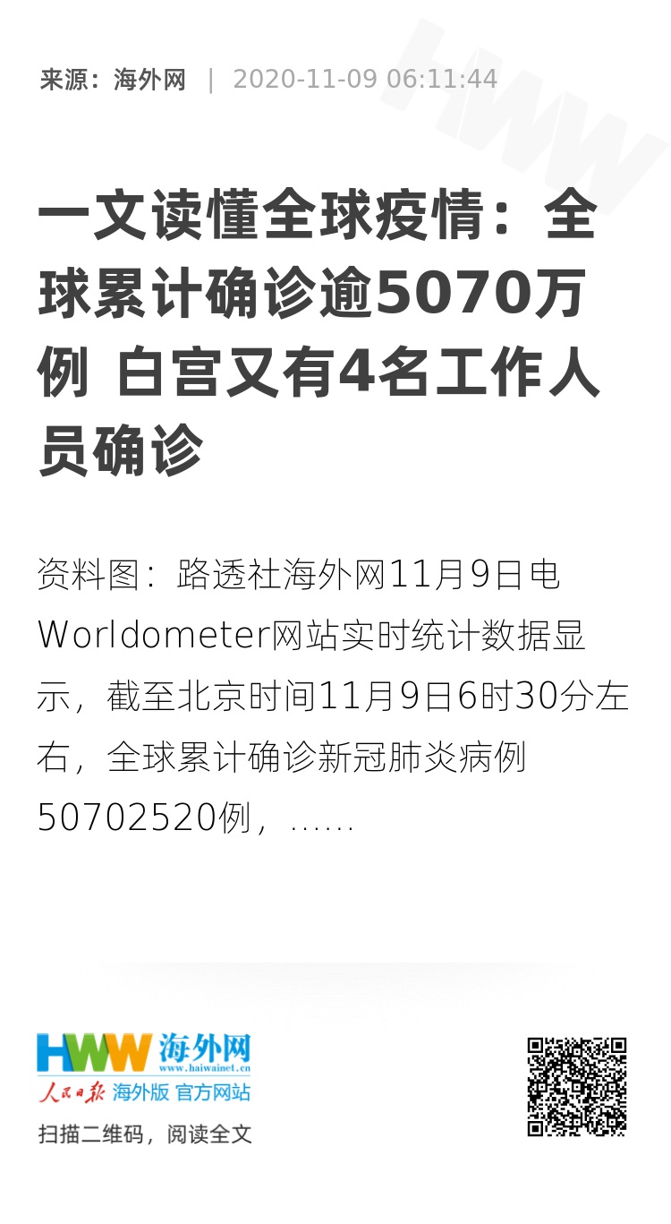 海外网11月9日电 Worldometer网站实时统计数据显示,截至北京时间11月9日6时30分左右,全球累计确诊新冠肺炎病例50702520例,累计死亡病例1261257例,112个国家和地区确诊病例超过万例。