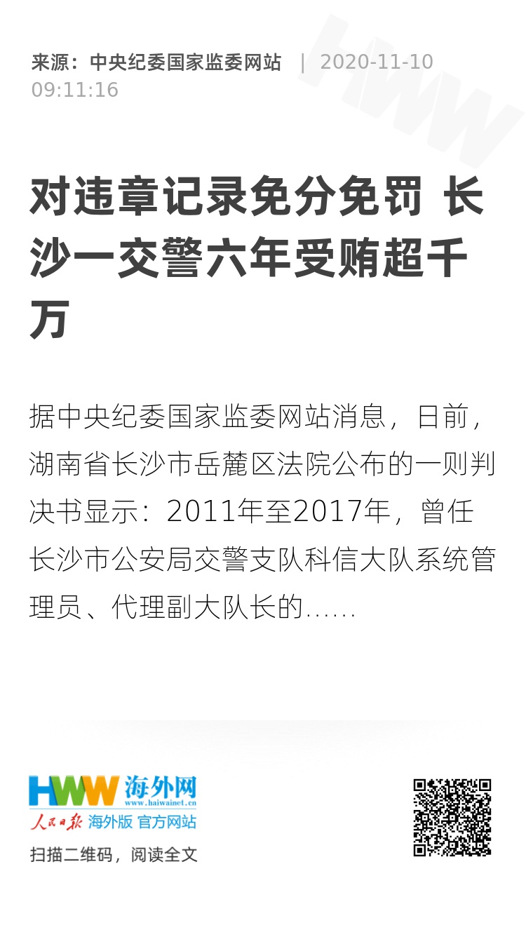 据中央纪委国家监委网站消息,日前,湖南省长沙市岳麓区法院公布的一则判决书显示:2011年至2017年,曾任长沙市公安局交警支队科信大队系统管理员、代理副大队长的姚克锋,利用职务便利,在全国公安交通安全综合服务管理平台的违法处罚系统中,对请托人的电子违章记录擅自免分、免罚,或修改记录从而降低处罚金额。在此过程中,姚克锋通过“中间人”收受好处费,涉案金额高达一千余万元。