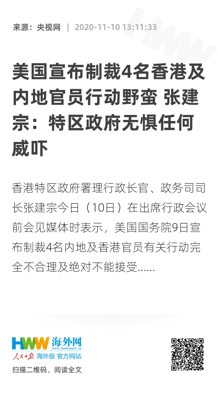 张建宗表示,美国的有关行动完全不合理,绝对不能接受,他批评美国野蛮干预香港及中国内部事务。张建宗又说,美国实施制裁的做法是违反国际惯例及国际法,他强调特区政府有责任维护国家安全,无惧任何威吓。