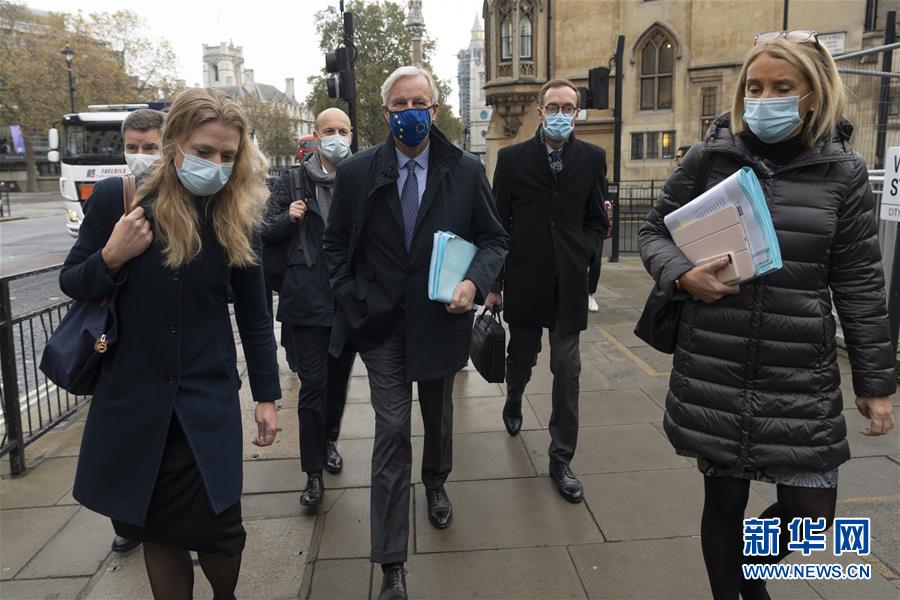 11月9日,在英国伦敦,欧盟首席谈判代表米歇尔·巴尼耶(右三)前往与英方谈判的地点。 英国首相约翰逊7日与欧盟委员会主席冯德莱恩通电话,讨论双方以贸易协议为核心的未来关系谈判最新进展,并决定下周在伦敦继续谈判。双方同意,英国和欧盟的谈判团队将于9日开始在伦敦继续谈判,加倍努力以达成协议。 新华社发(雷伊·唐摄)