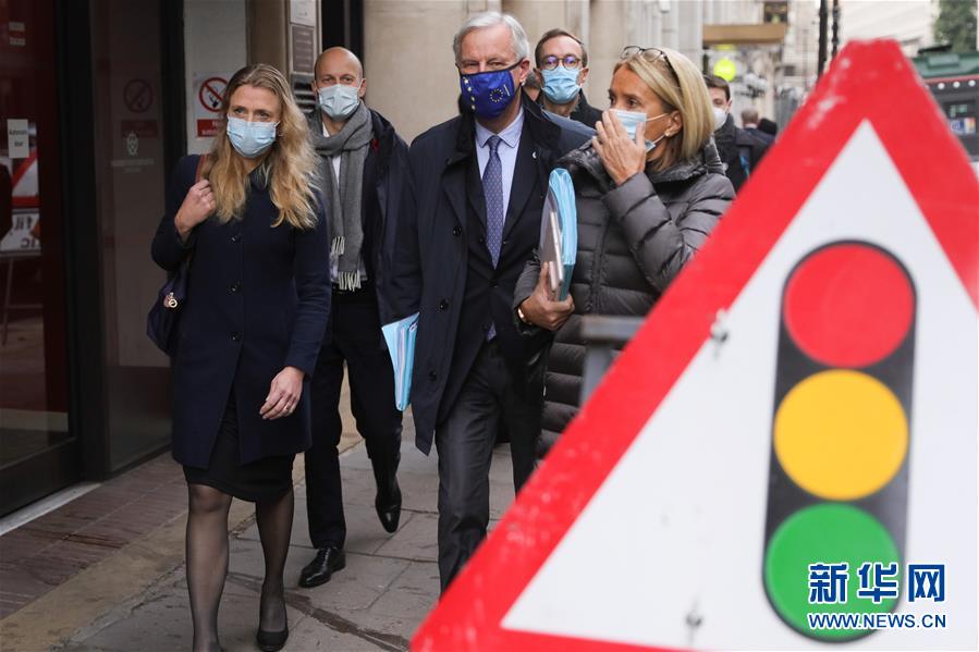11月9日,在英国伦敦,欧盟首席谈判代表米歇尔·巴尼耶(左三)前往与英方谈判的地点。 英国首相约翰逊7日与欧盟委员会主席冯德莱恩通电话,讨论双方以贸易协议为核心的未来关系谈判最新进展,并决定下周在伦敦继续谈判。双方同意,英国和欧盟的谈判团队将于9日开始在伦敦继续谈判,加倍努力以达成协议。 新华社发(蒂姆·爱尔兰摄)