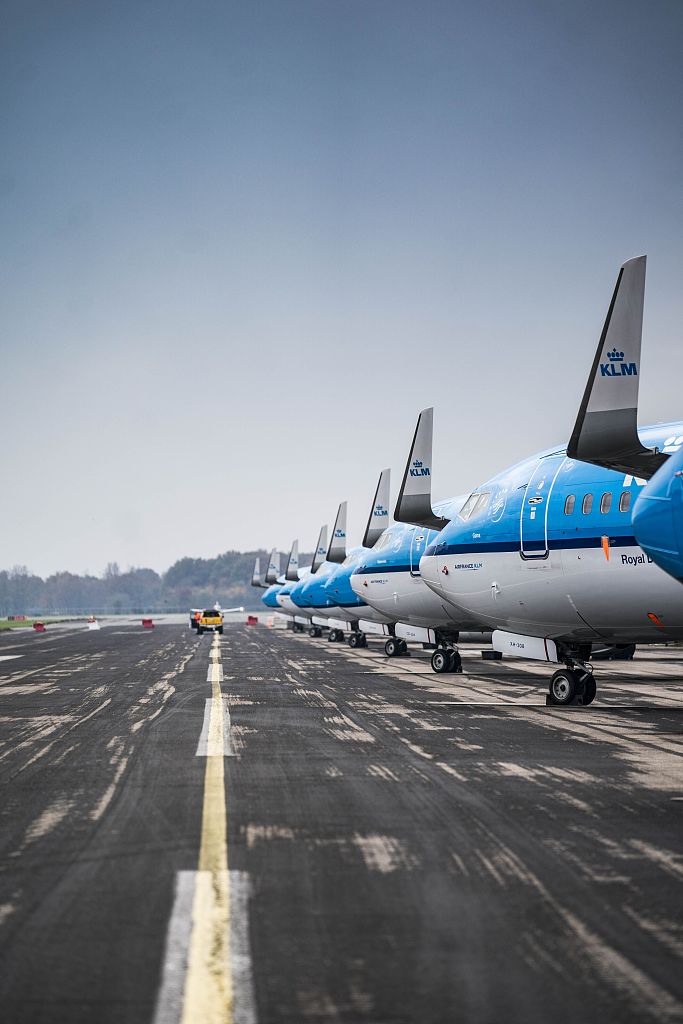 当地时间2020年11月9日,荷兰格罗宁根机场,受疫情影响客流量不足,停机坪停靠着12架荷航客机。荷兰航空公司迎来了经济“寒冬”。图片来源:视觉中国