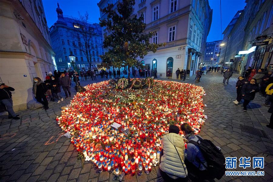 近日,不少维也纳市民自发来到维也纳枪击事件遇难者遇害地,点燃蜡烛寄托哀思。奥地利首都维也纳11月2日晚发生枪击事件。奥总理库尔茨谴责这起事件是“卑劣的恐怖袭击”。 新华社发(乔治斯·施耐德摄)