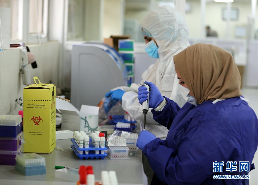 11月8日,在伊拉克巴格达,工作人员在中国援建伊拉克抗击新冠疫情的核酸检测实验室里检测样本。 伊拉克卫生部9日发布的新冠疫情数据显示,该国累计确诊病例超过50万例。疫情最严重的首都巴格达当天新增确诊病例1225例。当天该国共完成1.7万例样本检测。 新华社发