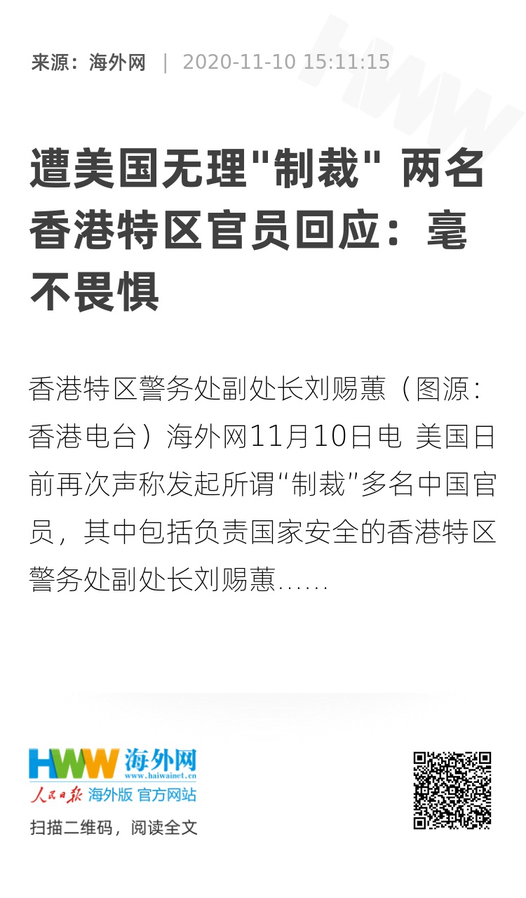 海外网11月10日电 美国日前再次声称发起所谓“制裁”多名中国官员,其中包括负责国家安全的香港特区警务处副处长刘赐蕙、警务处国家安全处高级警司李桂华。两位特区政府官员10日表示,美国的“制裁”徒劳无功,对此毫不畏惧,不会因此动摇护法执法的决心。