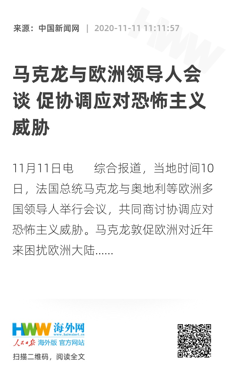 在此背景下,当地时间11月10日,法国总统马克龙与奥地利、德国、荷兰和欧盟领导人举行会议,共同商讨协调应对恐怖主义威胁。