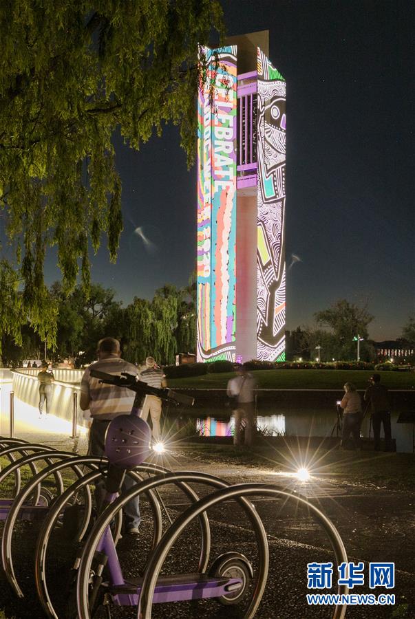 11月10日,在澳大利亚首都堪培拉举行的原住民文化艺术展上,人们观看国家钟楼上的投影。 澳大利亚首都堪培拉11月8日至15日在国家钟楼举行原住民文化艺术展。 新华社发(刘畅畅 摄)