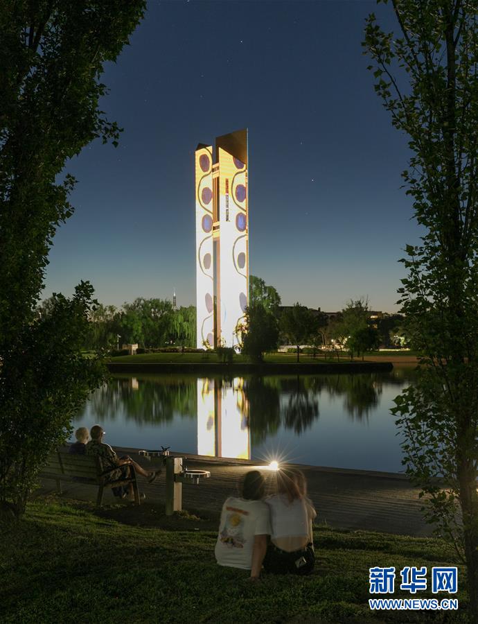 11月10日,在澳大利亚首都堪培拉举行的原住民文化艺术展上,人们观看国家钟楼上的投影。 澳大利亚首都堪培拉11月8日至15日在国家钟楼举行原住民文化艺术展。 新华社发(刘畅畅 摄)