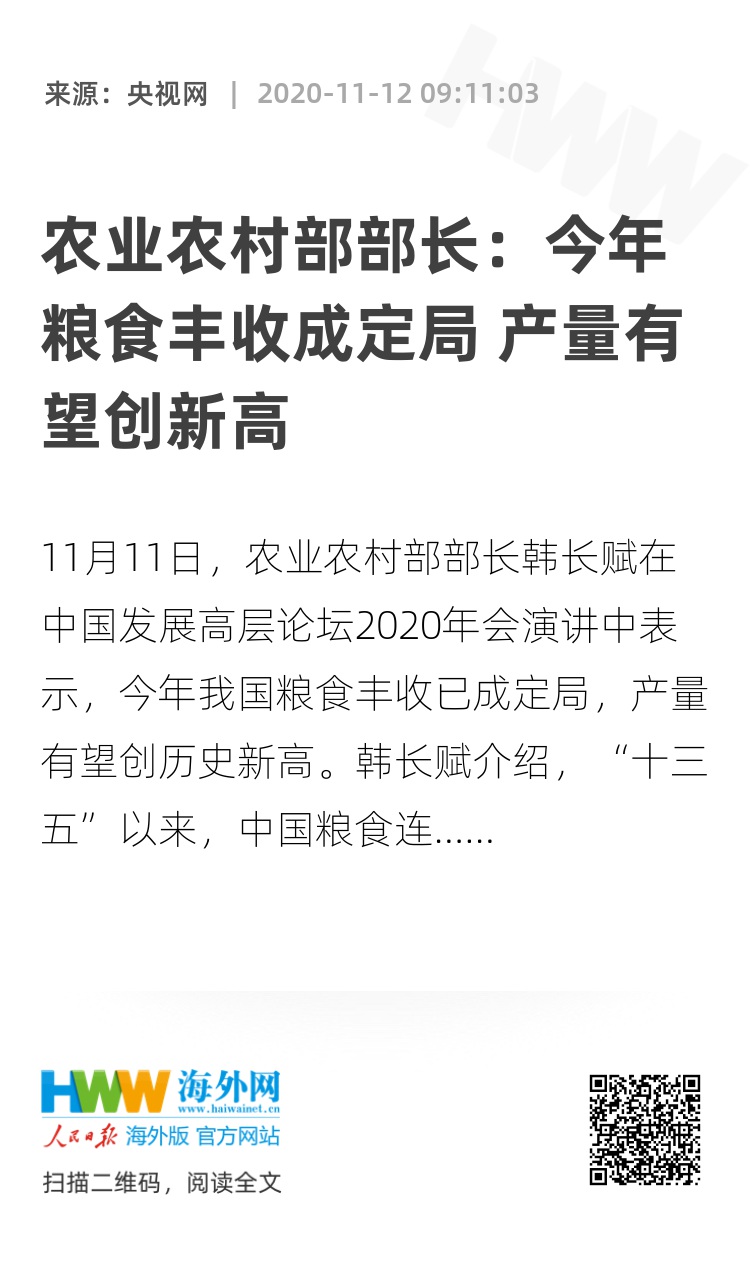 农业农村部部长 韩长赋:今年,中国粮食和农业经受住了新冠肺炎疫情的大考,交上了圆满的答卷。未来,中国政府将始终把“三农”工作作为重中之重,绝不放松粮食生产,把14亿中国人的饭碗牢牢端在手中,我们愿与世界各国分享中国发展粮食生产的经验,共同维护世界粮食安全。