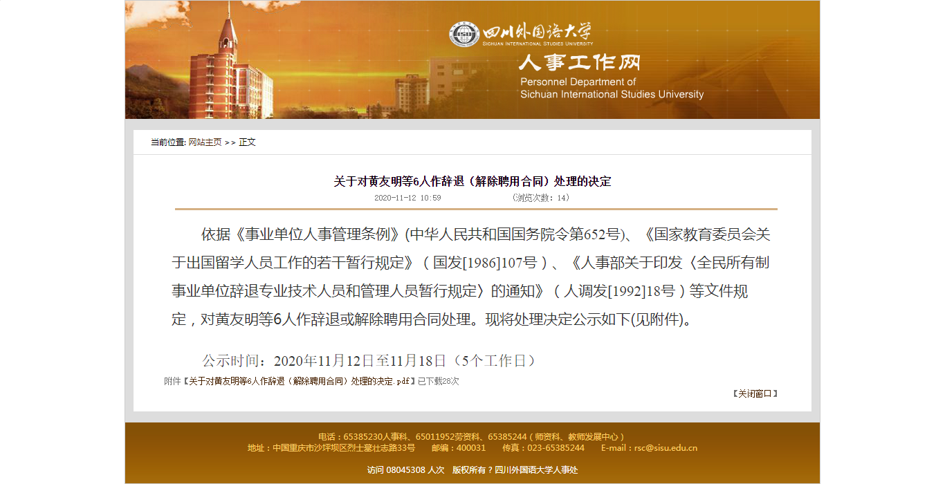 11月12日,四川外国语大学人事工作网公示一则《关于对黄友明等6人作辞退(解除聘用合同)处理的决定 》,公示时间为2020年11月12日至11月18日。
