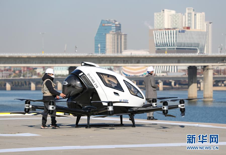11月11日,在韩国首尔汝矣岛汉江公园,工作人员对中国亿航智能技术有限公司研发的双座自动驾驶飞行器“EH216”进行试飞前的准备。韩国首尔市政府11日在首尔汝矣岛上空开展了“空中出租车”无人试飞活动。一款中国研制的自动驾驶飞行器参加试飞。新华社记者 王婧嫱 摄