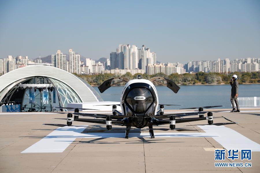 11月11日,中国亿航智能技术有限公司研发的双座自动驾驶飞行器“EH216”停放在韩国首尔汝矣岛汉江公园。韩国首尔市政府11日在首尔汝矣岛上空开展了“空中出租车”无人试飞活动。一款中国研制的自动驾驶飞行器参加试飞。新华社记者 王婧嫱 摄