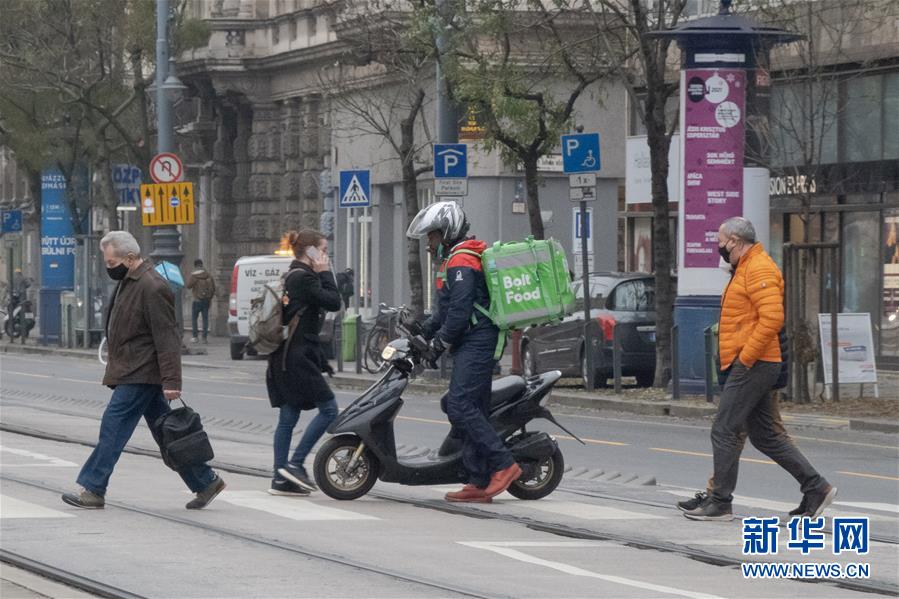 这是11月11日在匈牙利首都布达佩斯街头拍摄的外卖送餐员。 匈牙利自11日零时起实行更严格的疫情防控措施,包括每日20时至次日5时实行全国宵禁、餐馆只允许提供送餐服务、大学改为线上授课等。 新华社发(弗尔季·奥蒂洛 摄)