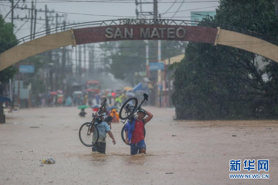 11月12日,在菲律宾黎刹省,当地居民在洪水中前行。受台风“环高”影响,菲律宾部分地区发生洪水灾害。新华社发(乌马利摄)