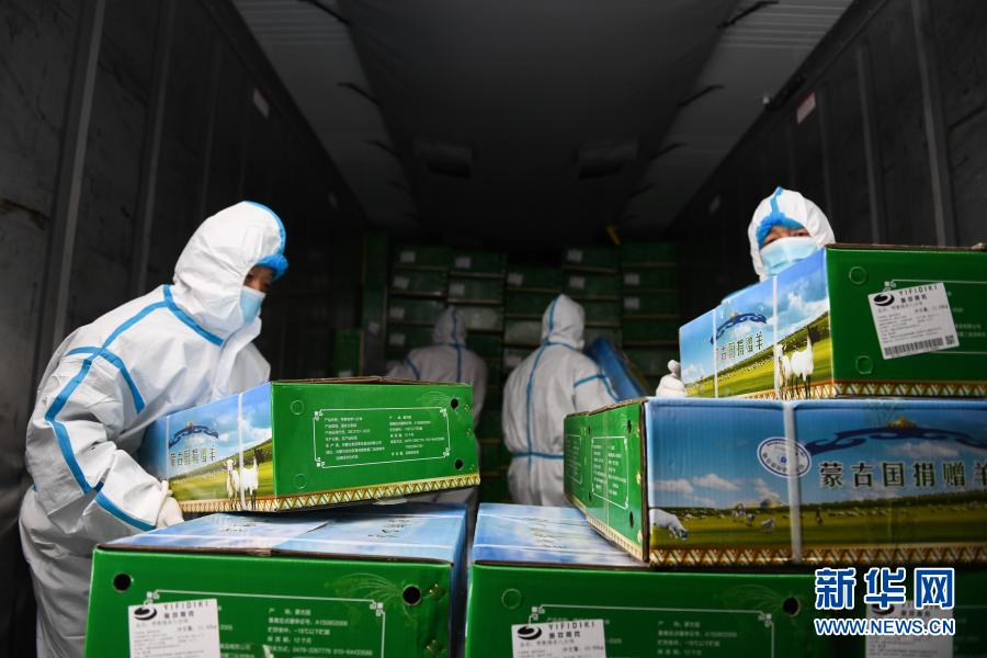 11月12日上午,首批加工完毕的1.2万只蒙古国捐赠羊完成装车,随即从内蒙古自治区二连浩特市启程,前往湖北省武汉市。新华社记者 刘磊 摄